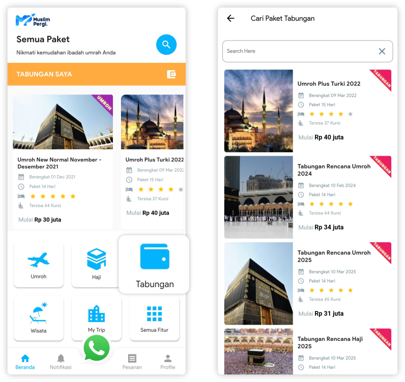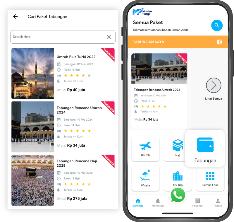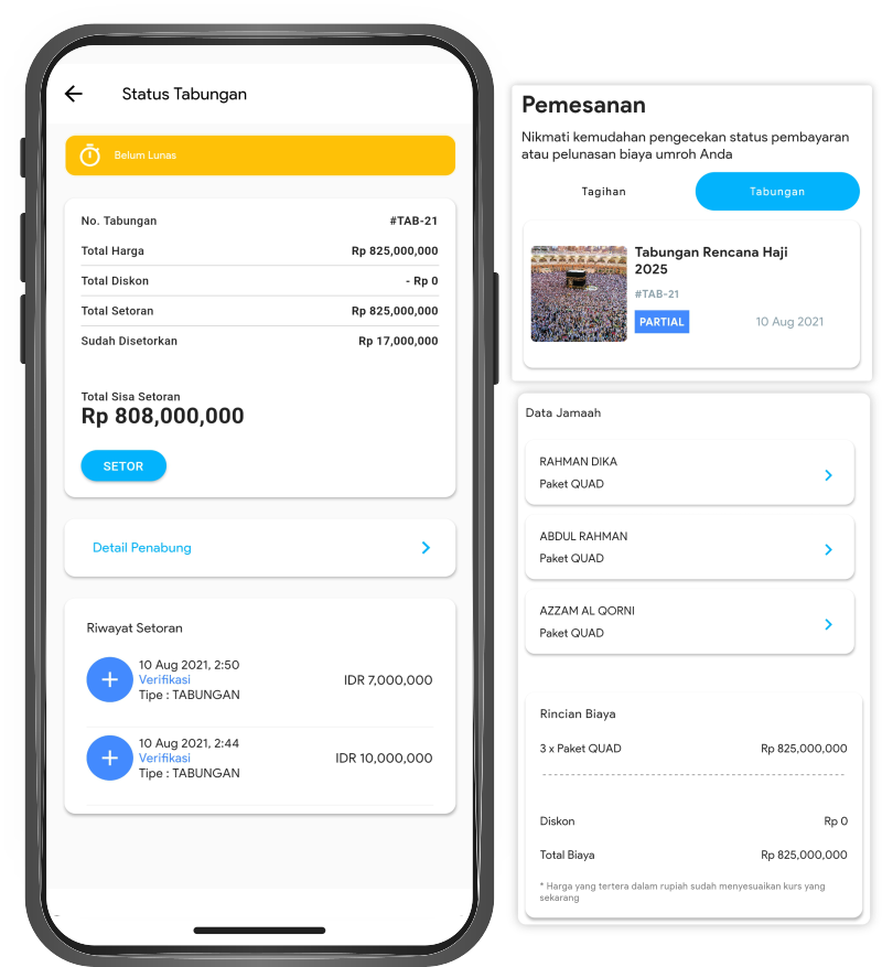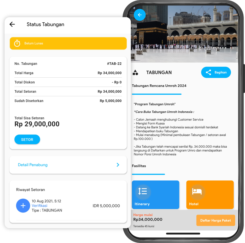 Memudahkan Jamaah Umroh & Haji Untuk Menyimpan Uang Pada Perencanaan Keberangkatan Ibadahnya langsung dari smartphone. Jamaah cukup dengan memilih paket perencanaan keberangkatan yang telah disediakan oleh Biro Travel yang sesuai dengan keinginan dan menyetor cicilan pembayaran dari paket keberangkatan yang telah dipesannya maka semua data tabungan jamaah sudah tercatat kedalam fitur Tabungan Umroh Haji.