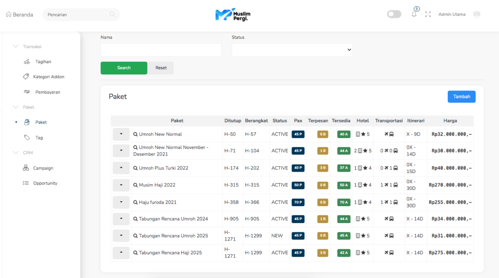 Lalu, pada halaman ini admin biro travel dapat melihat keselurahan paket yang ada. Dan untuk membuat paket perencanaan keberangkatan, admin travel cukup menekan tombol Tambah berwarna biru pada gambar diatas untuk.