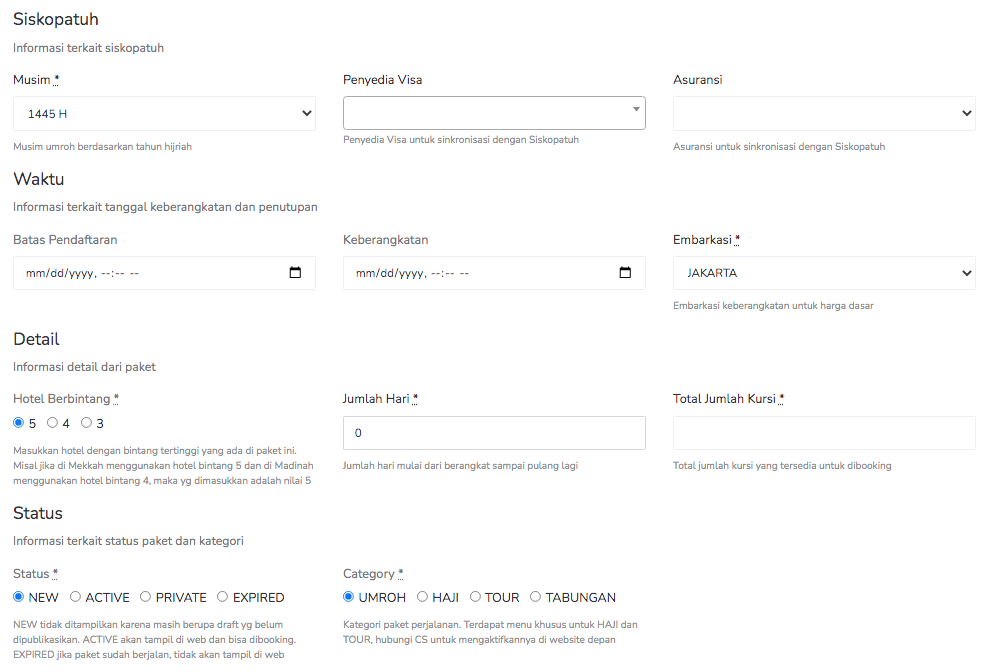 Pada dasarnya, pembuatan paket perencanaan keberangkatan umroh atau haji ini sama seperti pembuatan paket paket keberangkatan ibadah umroh dan haji pada umumnya dengan sistem Muslimpergi. Namun yang membedakan adalah, pada gambar diatas terdapat kolom yang bisa admin biro travel isi jauh jauh hari (1,2, atau 3 tahun kedepan bahkan lebih). Dengan memilih Category Tabungan pada Status Paket yang sedang dibuat, maka pihak admin biro travel dapat membuat paket ini aktif untuk jangka waktu yg lama sesuai yang ditentukan oleh Pihak Biro untuk para calon jamaahnya yang ingin memiliki paket keberangkatan ibadahnya 1 tahun kedepan atau lebih.