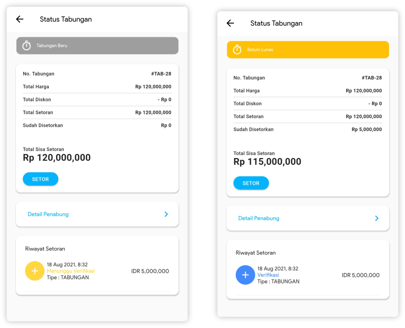Pada tahap akhir, tepat setelah melakukan setoran / pembayaran awal pada paket perencanaan keberangkatan maka Penabung mendapat invoice seperti gambar diatas ini. Pada gambar sebelah kiri terdapat 1 Riwayat Pembayaran yang telah tercatat pada invoice ini yang masih berstatus Menunggu Verifikasi yang artinya menunggu konfirmasi dari Pihak Biro Travel. Dan pada gambar sebelah kanan adalah Pembayaran yang sudah terverifikasi oleh Pihak Finance Biro Travel. Dengan begitu, Total sisa pembayaran pada paket perencanaan keberangkatan yang telah dipesan oleh penabung berkurang dan terus berkurang dengan setoran yang terus berjalan seiring waktu sampai pada waktu lunasnya Nominal Pembayaran maka jamaah dapat mengajukan ke pihak biro untuk berangkat sesuai dengan perencanaan keberangkatan ibadah yang telah dipesan sebelumnya.