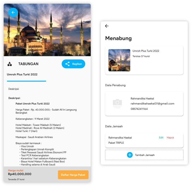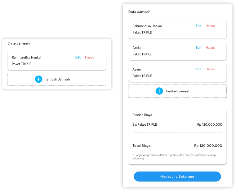 Sesampainya pada halaman Menabung, Penabung / Jamaah yang sedang memesan sampai pada tahap ini, bisa menambahkan diri sendiri sebagai calon jamaah yang ikut dalam program paket perencanaan keberangkatan ini.