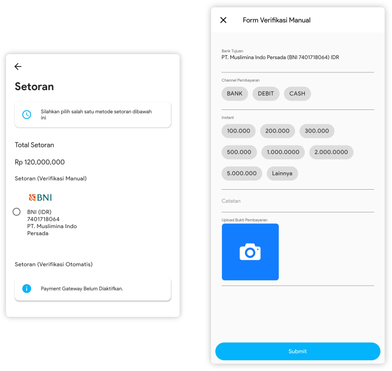 Setelah melewati tahapan Menabung seperti pada contoh gambar sebelumnya, tahap selanjutnya adalah melakukan pembayaran / setoran awal pada paket perencanaan yang baru saja dipesan. Dengan memilih cara pembayaran yang tersedia pada halaman setoran ini, lalu isi form pembayaran yang ada pada halaman Verifikasi Pembayaran. Upload bukti pembayaran jika jamaah memilih untuk melakukan pembayaran dengan metode verifikasi manual lalu klik submit.