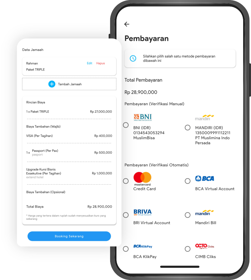 Muslimpergi menghadirkan fitur Payment Gateaway Integration. Jadi, setiap Jamaah Biro Umroh Anda dengan mudah dapat memilih cara pembayaran sesuai keinginannya. Tidak lagi harus ribet melakukan pembayaran antara jamaah dan agen atau biro umroh anda!