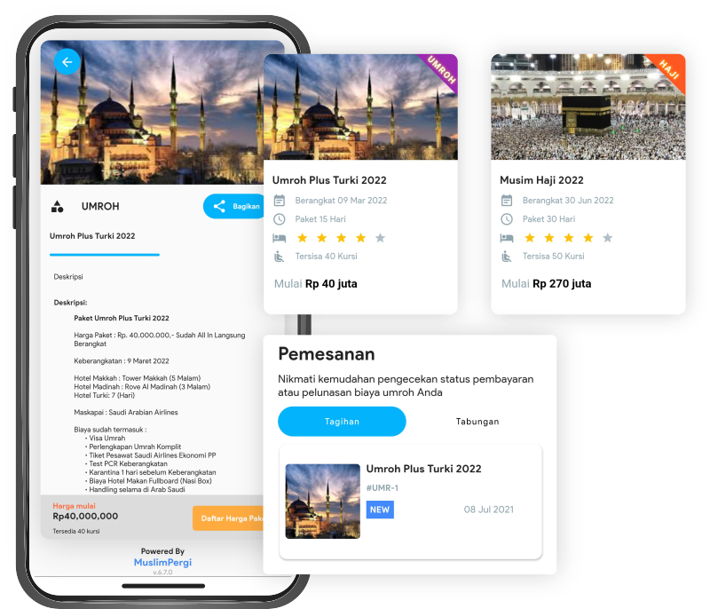 Membuat sistem manajemen travel umroh berbasis digital user friendly bukanlah suatu hal yang mudah. Dengan sistem MuslimPergi Anda tidak perlu melewati proses yang panjang dan menyita waktu tersebut. Anda dapat menggunakan langsung sistem kami didepan dan bayar setelah jama’ah berangkat.