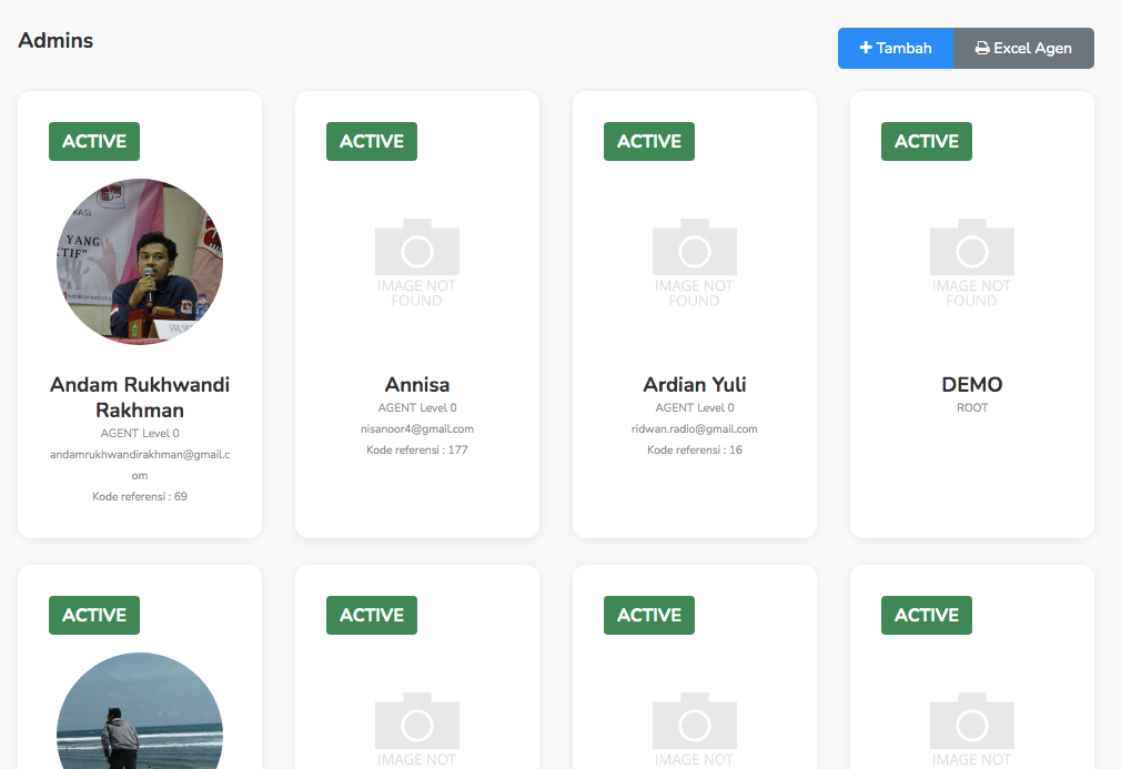 Pada page anggota, Admin Main bisa melihat daftar admin dan juga bisa menambah admin level dibawahnya dengan menekan tombol tambah pada pojok kanan atas dan juga bisa mengunduh list agen ke dalam bentuk excel.