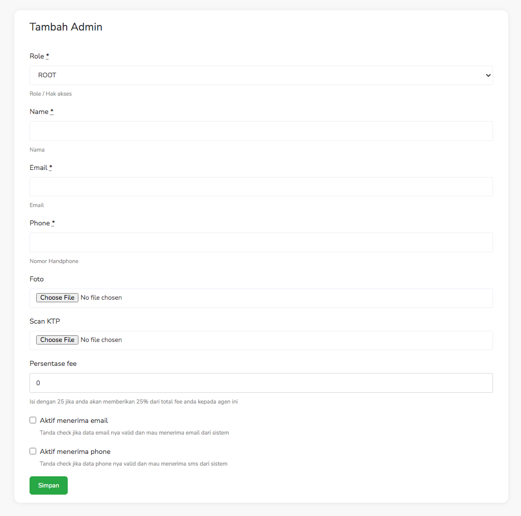 Setelah menekan tombol tambah maka akan diarahkan ke form tambah admin setelah itu mengisi nama, email, no telepon, foto, scan ktp dan persentase fee dan juga bisa menerima notifikasi email dan notifikasi by phone.