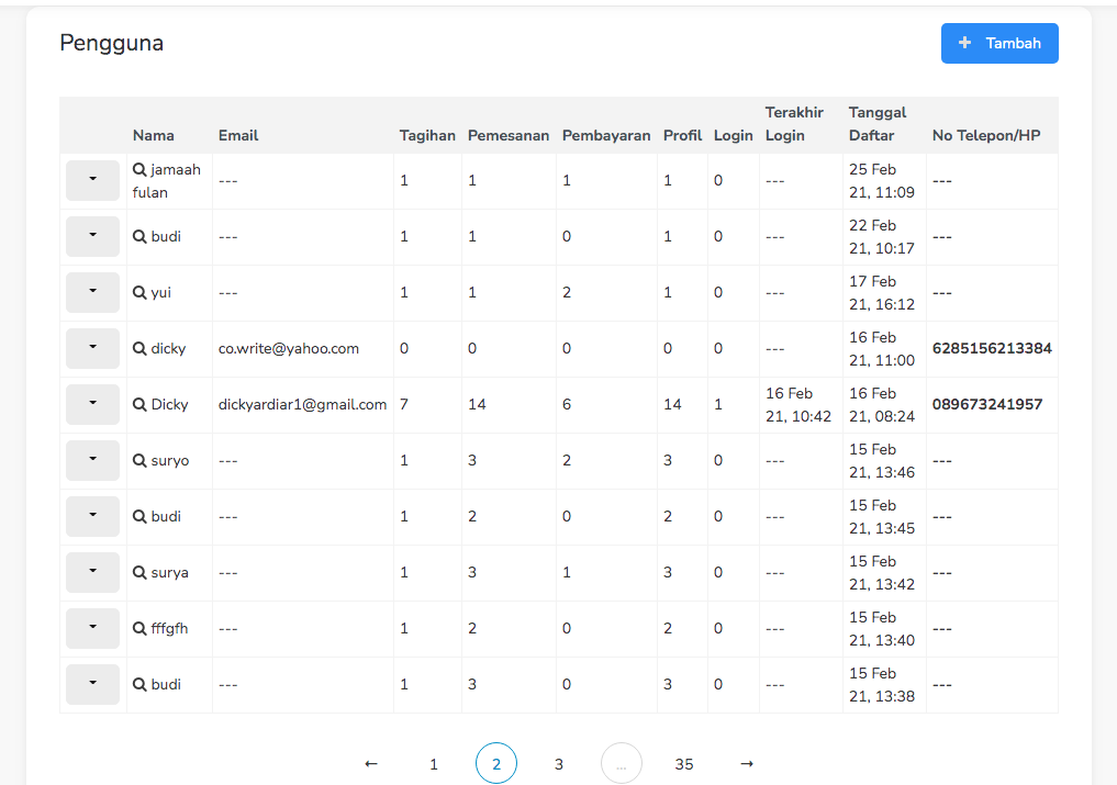 Pada halaman user(jama'ah), ditampilkan user yang sudah mendaftar atau membeli paket pada agen jika ingin menambah user maka menekan tombol tambah pada pojok kanan atas.