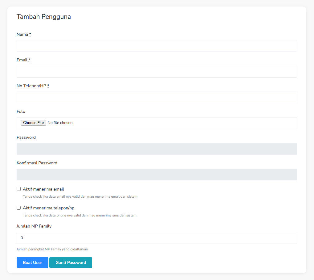Jika sudah masuk ke laman tambah user maka admin harus memasukan data diri user sebagai syarat pendaftaran seperti Nama, Email, No HP, Foto, Password, konfirmasi password, notifikasi password dan handphone jumlah MP family jika ingin merubah password maka masukan password baru dan konfirmasi password baru kemudian klik tombol ganti password.