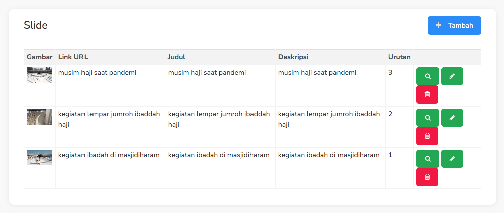 Pada halaman ini, admin main bisa menambahkan testimoni dari alumni jama'ah pada perjalanan ibadah berupa gambar.