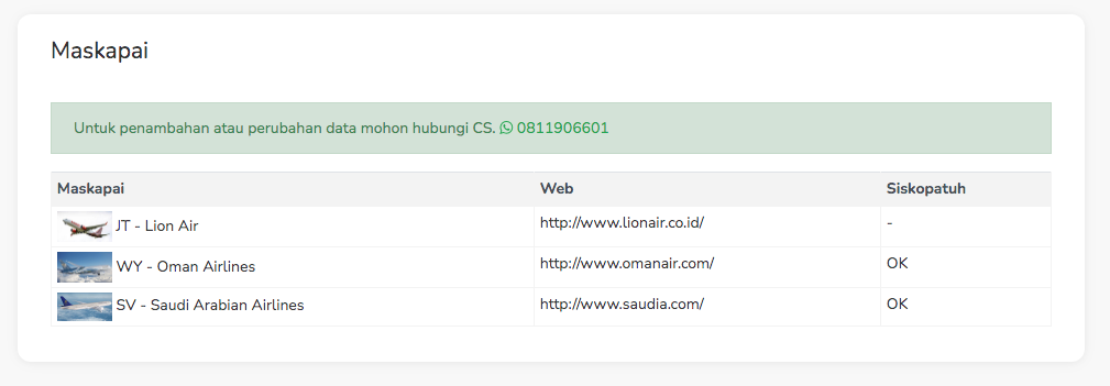 Pada tab maskapai ada beberapa maskapai penerbangan yang digunakan dalam pelayanan jamaah jika ingin menambahkan maskapai penerbangan maka admin harus menghubungi customer service.