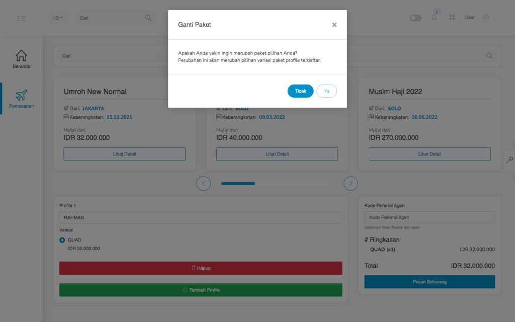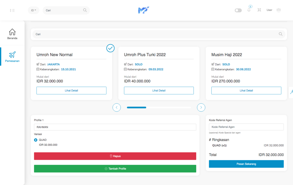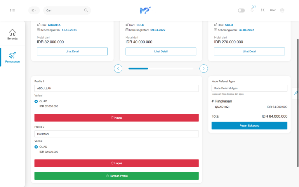 Setelah melakukan klik pesanan maka Anda harus memasukan nama-nama jamaah yang akan ikut serta umroh haji atau tour, kemudian klik pesan sekarang.