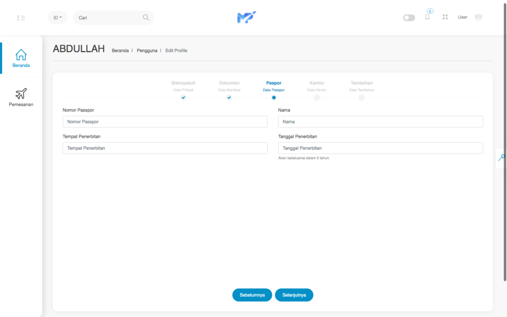 Jika sudah mempunyai passport diharapkan juga mengisi data passport berupa Nomor passport, Tempat penerbitan dan Tanggal penerbitan. setelah selesai kemudian klik tombol selanjutnya.
