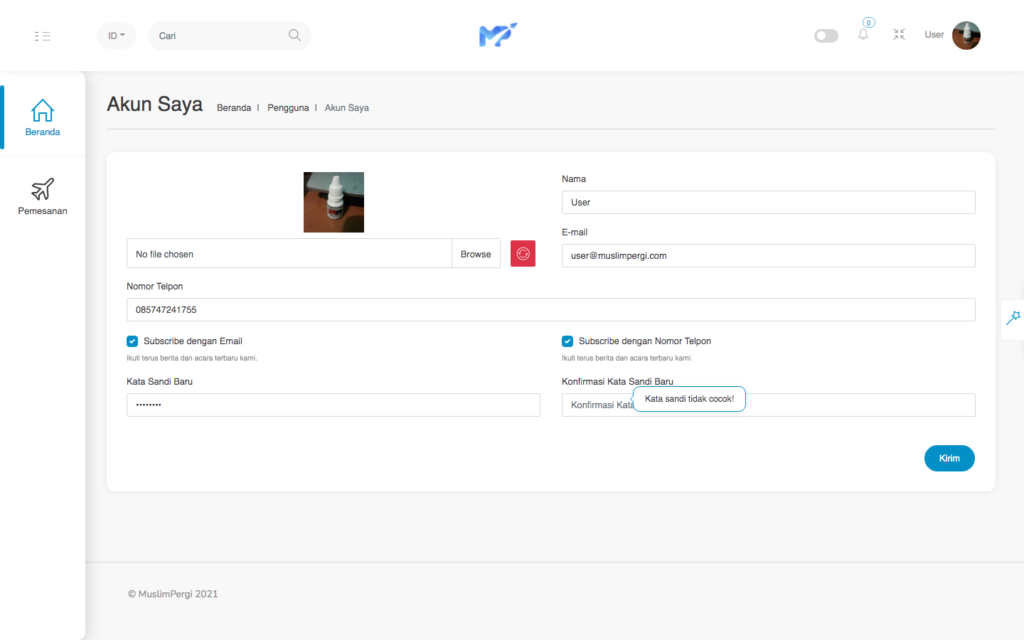 Jika sudah masuk maka akan muncul form profile user yang berisi nama, email, foto profile, nomor telepon, subcribe dengan email atau no telepon ada juga form kata sandi baru dan form konfirmasi kata sandi baru kemudian klik kirim. Dan jika ingin merubah kata sandi lama ke kata sandi yang baru maka masukan password baru ke form kata sandi baru dan ke form konfirmasi kata sandi baru setelah itu klik kirim.