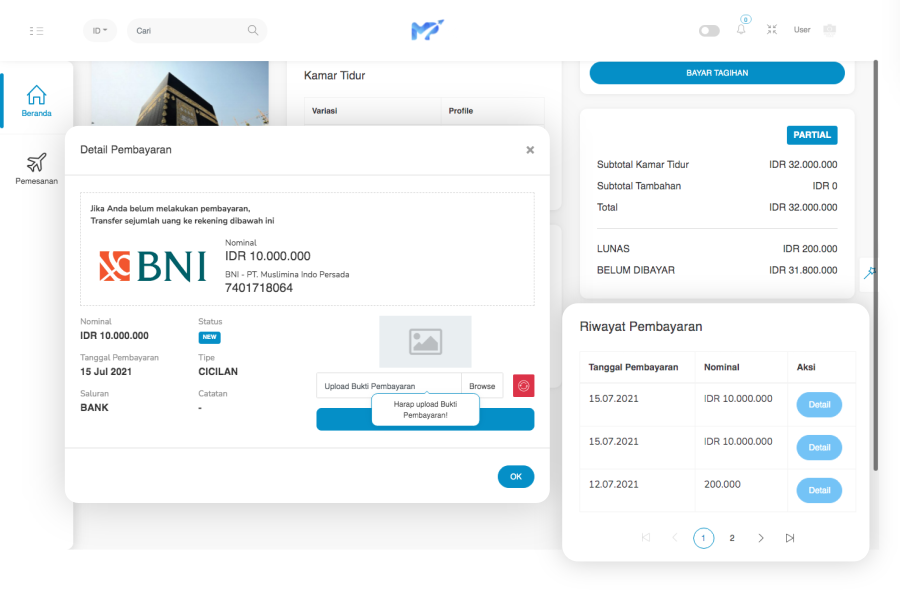 Jika anda melakukan klik pada detail pembayaran maka akan mucul nama bank, nominal pembayaran, status pembayaran, catatan, dan form untuk mengupload bukti transfer.