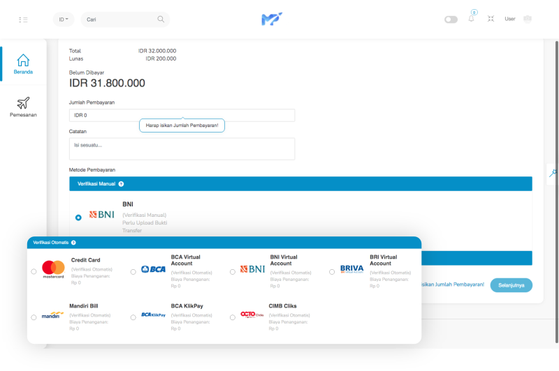 Lakukan pengisian form seperti jumlah biaya yang dibayarkan, pilih metode pembayaran yang telah disediakan : Verifikasi Manual atau Verifikasi Otomatis, kemudian catatan setelah itu klik tombol kirim.