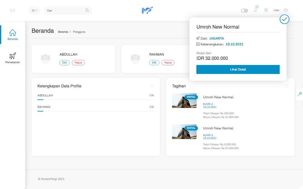 Untuk memasukan data Anda harus pergi ke beranda, bagian atas merupakan data jama’ah yang akan ikut umroh dan haji ketik tombol edit untuk melengkapi data-data dari jama’ah.